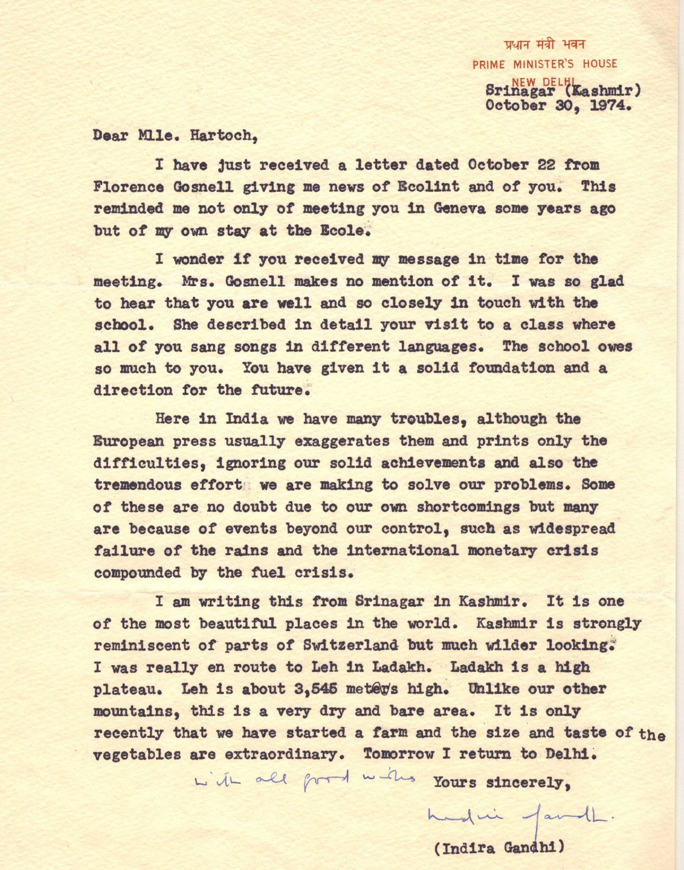 During her time in Ecolint, Indira developed an especially warm relationship with Mlle Else Hartoch. It stood the test of time, as is demonstrated by the letter reproduced here, which Mrs. Gandhi addressed spontaneously to her former teacher (now aged 95) in 1974. The irritation that she expresses at the unbalanced European media coverage of her country’s affairs is interestingly candid. The love that she reveals in the letter for the mountainous scenery of Kashmir, to which she was particularly attached, was originally generated by the Swiss Alps – the first such landscape that she encountered in her life.