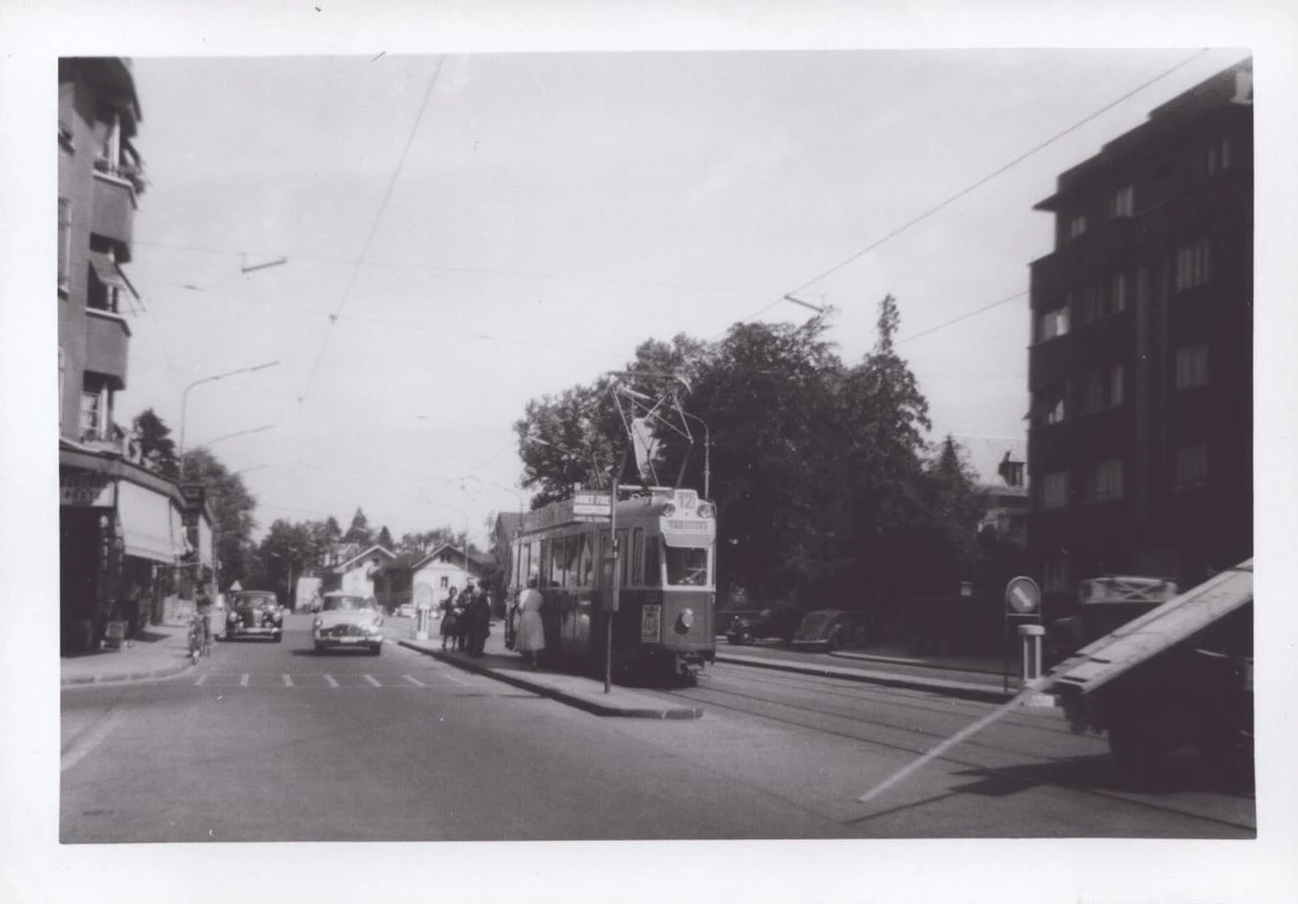 A location familiar to generations of Ecolint students: the Nº 12 tram stop closest to La Grande Boissière, Grange Canal. Although it has not changed substantially since the late 1950s, when this photograph was taken, the scene conveys vividly a quieter, less crowded and slower-paced era. The oncoming car is a Simca: a French make that was at the cutting edge of automobile design at the time, but was discontinued in 1978.