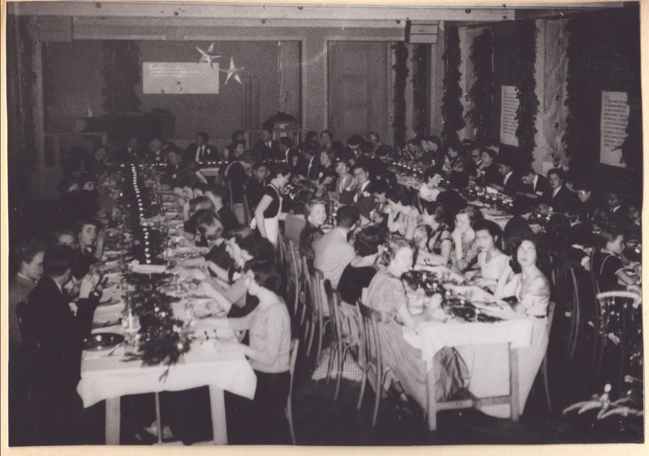 The 1955 Christmas dinner in La Grande Boissière’s dining room-cum-auditorium (now turned into Pavillon des langues classrooms) was a fairly formal, elegant affair. Fred Roquette, just about visible in the background, presides over the event from the school’s equivalent of an Oxford or Cambridge “High Table”.